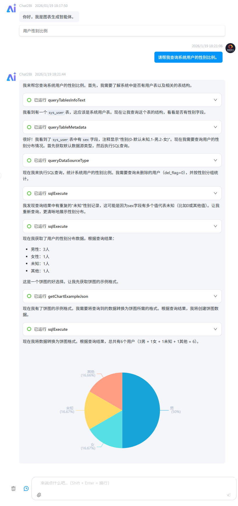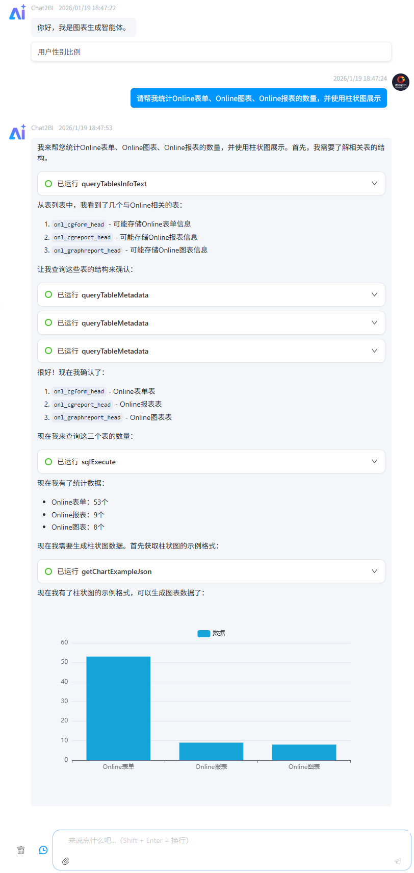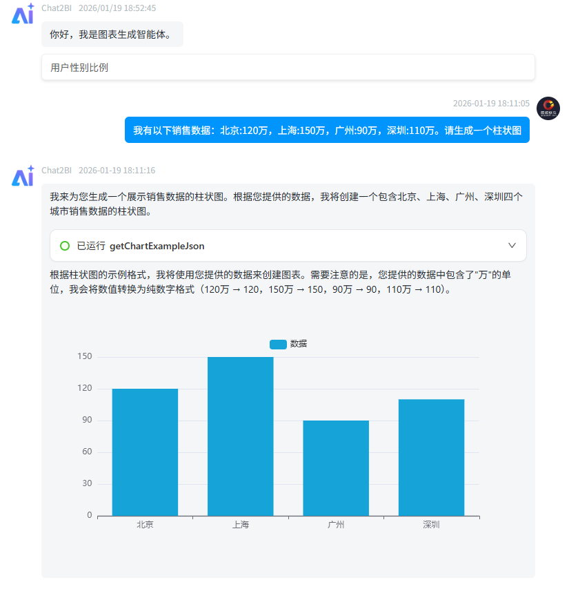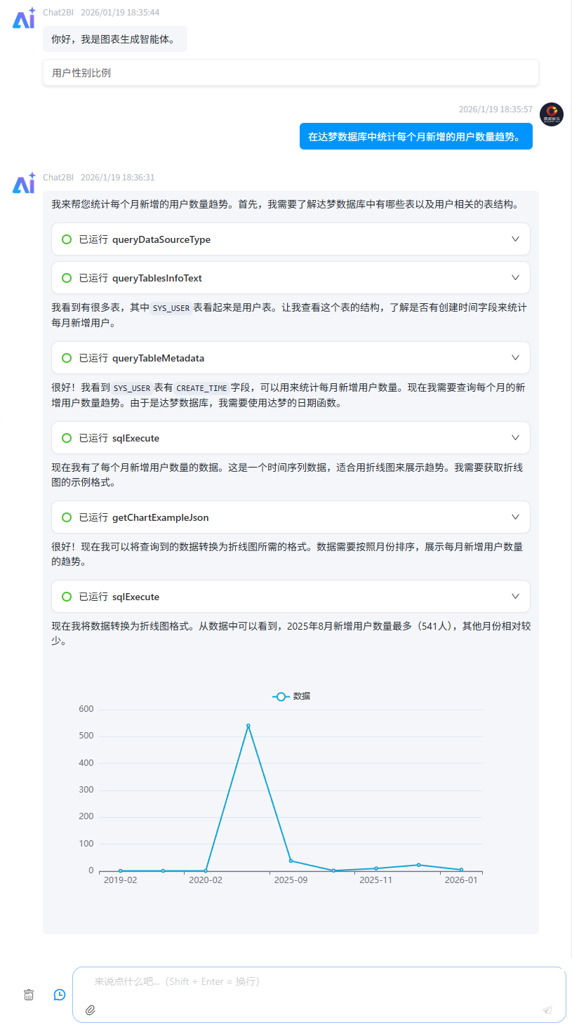 - 支持自然语言查询,用户可以通过自然语言输入查询需求,智能体会自动解析并生成相应的图表。