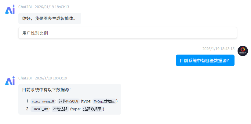 当你询问系统中有哪些数据源时,智能体会自动列出当前系统配置的所有数据源名称,方便你在后续查询中指定数据源。