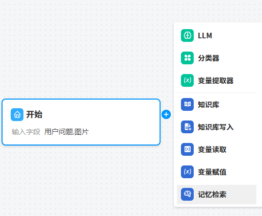 在画布中点击前一节点右侧的 ,在节点列表中选择记忆检索节点完成添加。