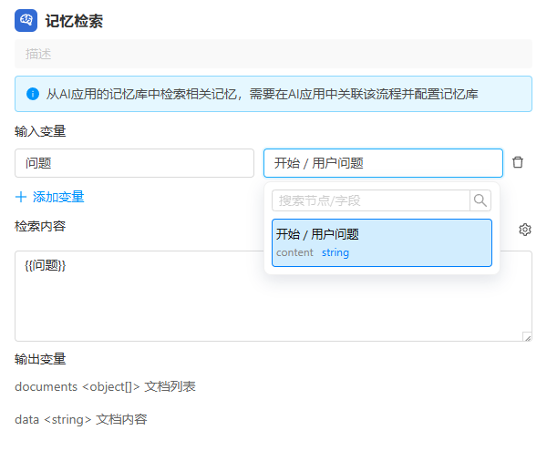 检索内容是发送给记忆库进行向量检索的查询语句,节点会根据该内容在记忆库中匹配最相关的记忆片段。