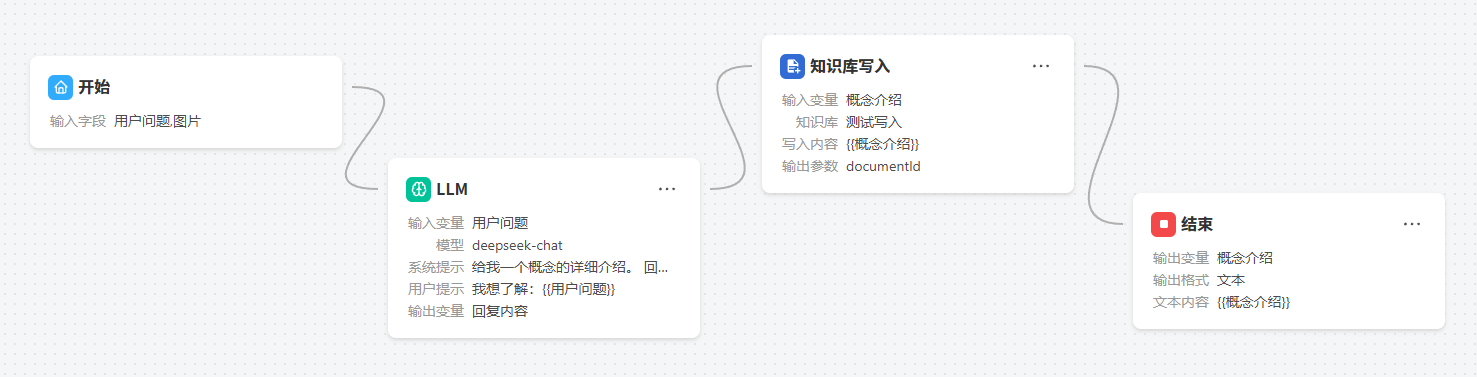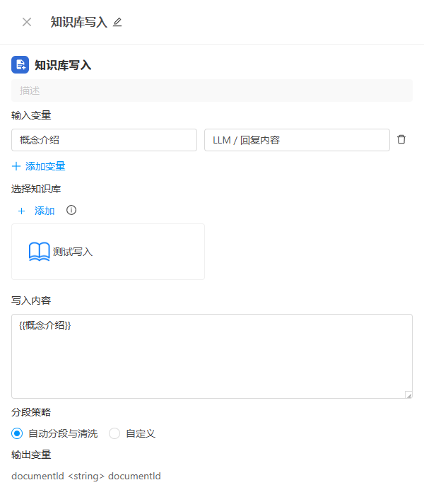 | documentId | string | 写入知识库后生成的文档 ID,可供后续节点引用 |