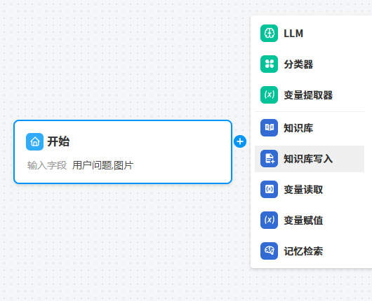 在画布中点击前一节点右侧的 ,选择知识库写入节点完成添加。