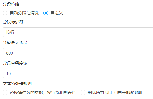 | 分段重叠度% | 相邻片段之间的重叠比例,范围 0~90,默认 10。适度重叠可保证语义连贯性 |