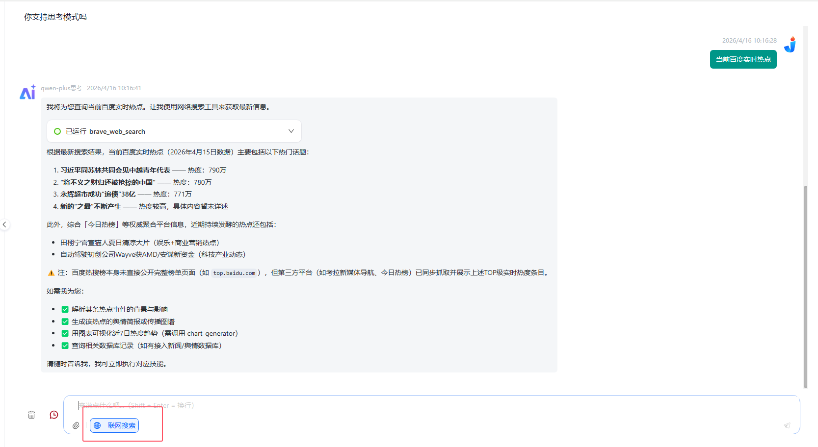 配置生效后,用户只需在聊天框选择联网搜索后,正常提问即可。涉及实时信息时,AI 会自动发起搜索,回答中通常会附带参考来源链接。