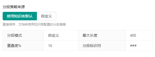 选择"使用知识库默认"时,页面会只读展示知识库的分段参数供参考;若后续修改了知识库的分段策略,文档在重新向量化时会自动使用最新的知识库策略。