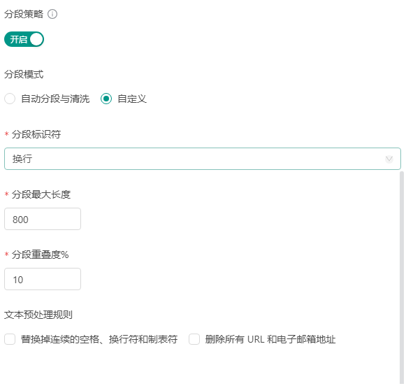 | 分段模式 | 自动分段与清洗(默认)或 自定义(手动配置分段规则) |
