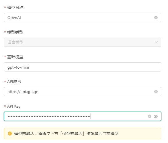 gpt-3.5-turbo。 - API域名:模型的API访问地址(由供应商提供)。