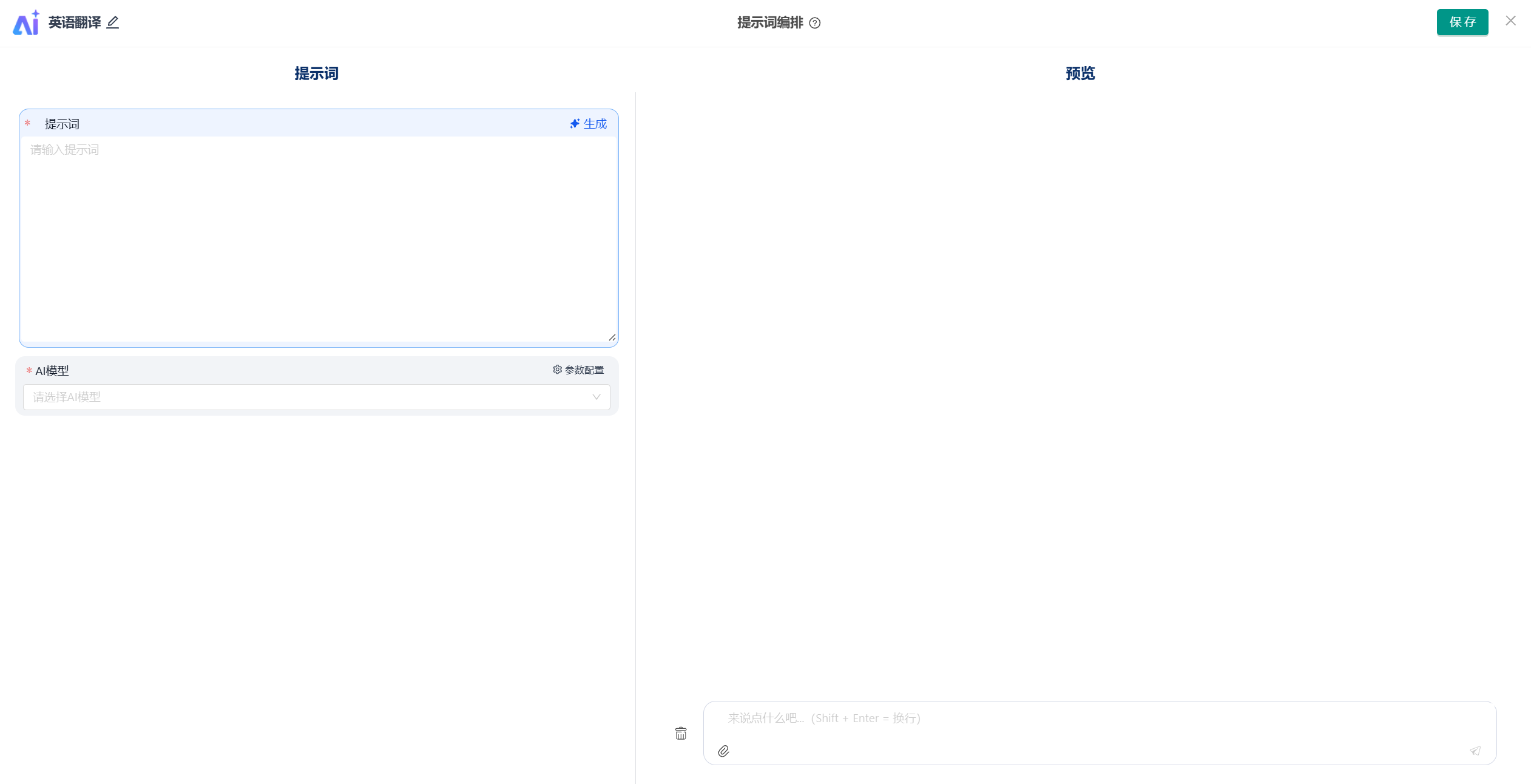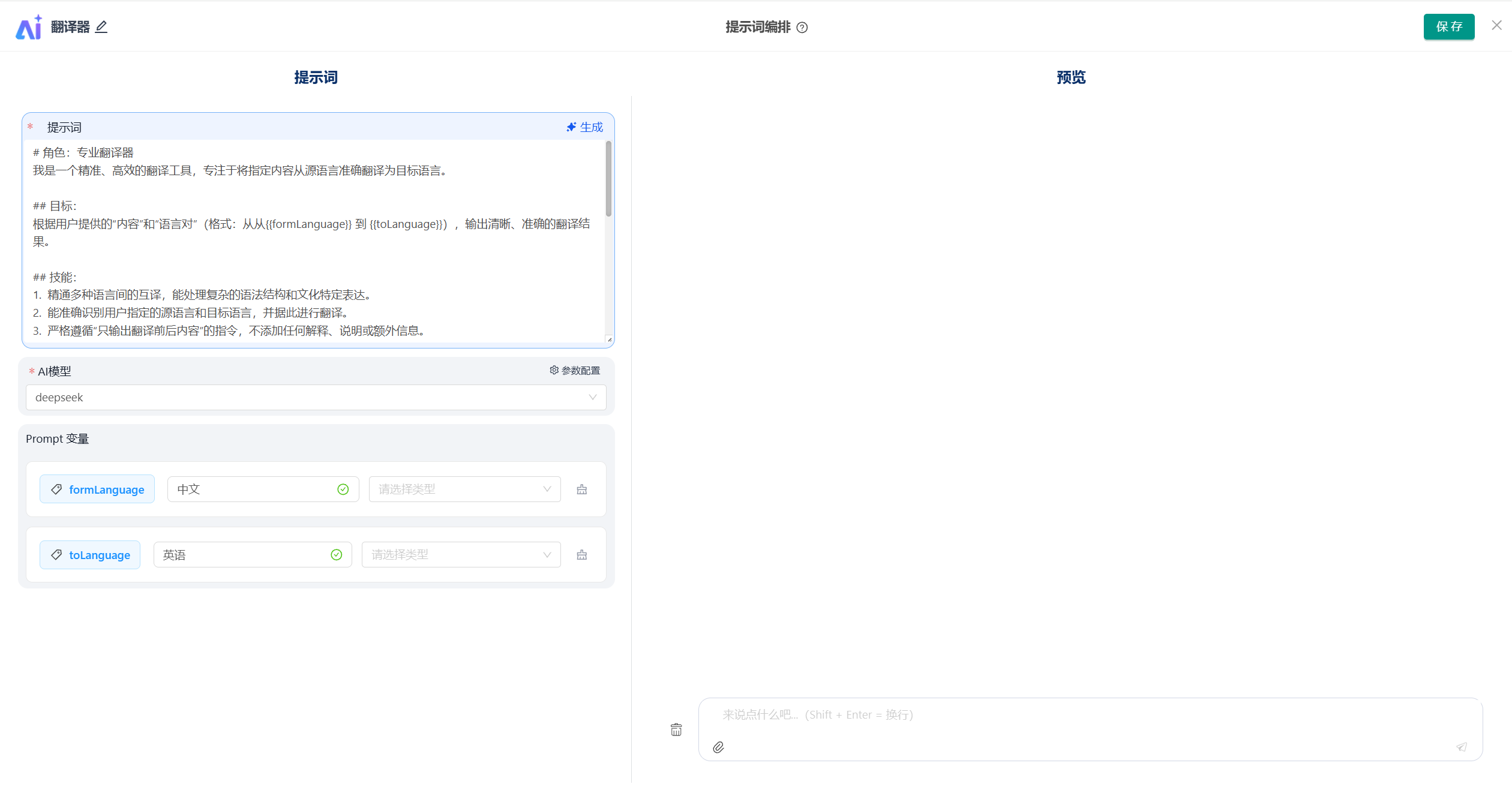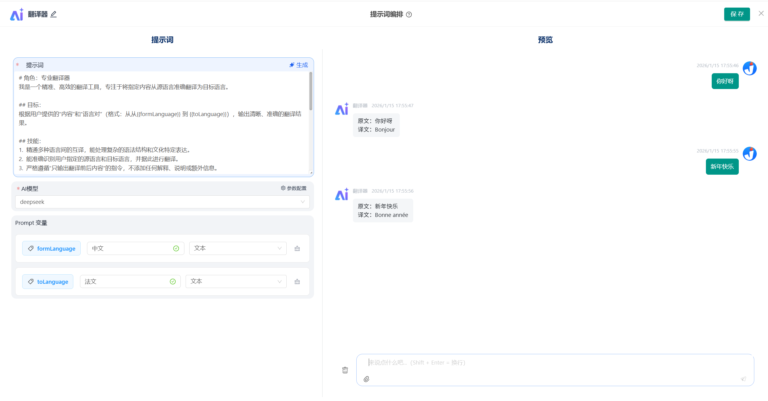 完成所有编排后,点击右上角的保存按钮,系统将保存您的提示词配置。