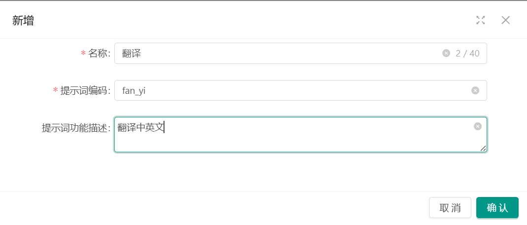 - 名称:为提示词设置一个清晰的功能名称,如"文本翻译"、"智能搜索"、"内容摘要"等