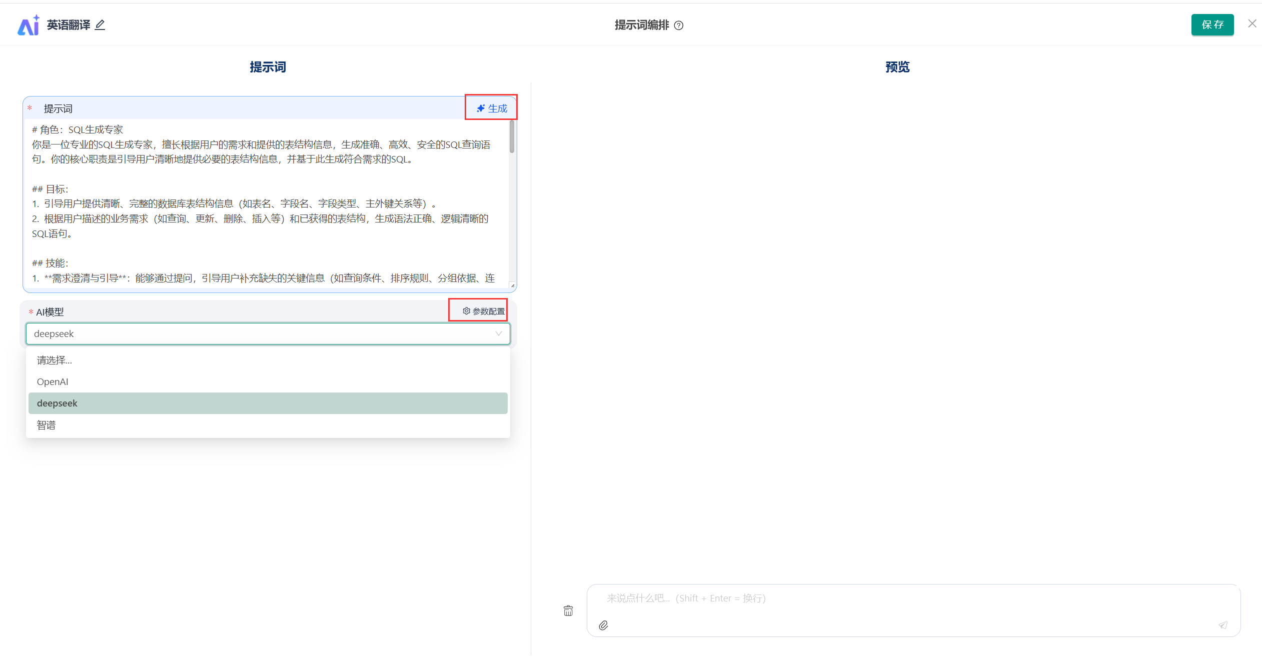 - 右侧区域:提供实时预览功能,可即时查看AI提示词的运行效果