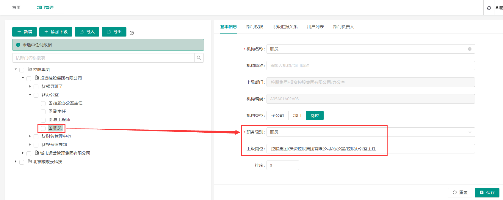 - 非董事长岗位:仅可选择当前父级部门及本部门更高职级的岗位
