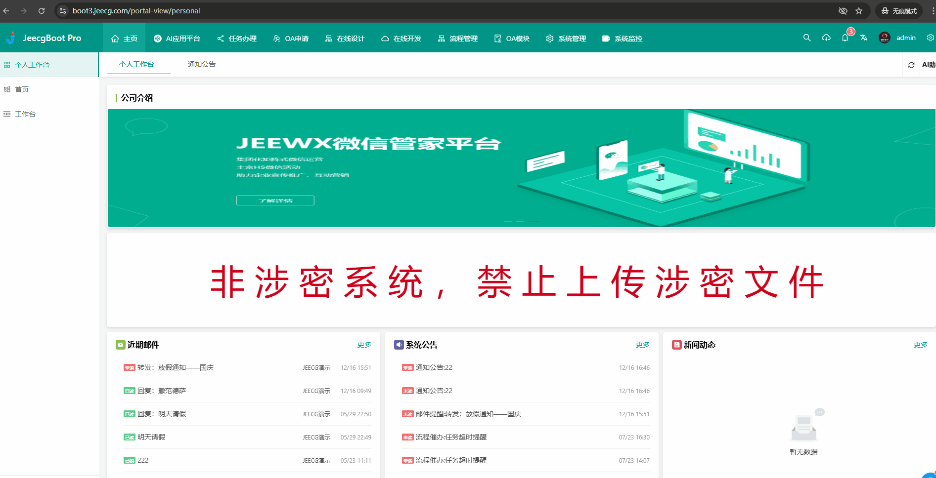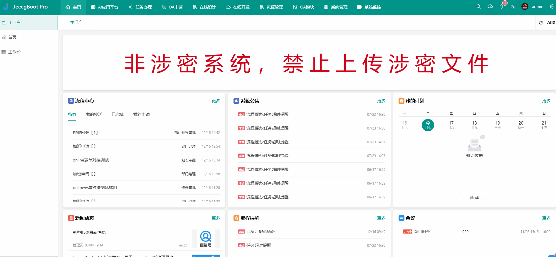 门户功能将系统的待办任务、新闻管理、会议、邮箱、快捷应用等整合在统一的门户中,用户可以快速处理任务、发起审批等操作,同时支持PC端和移动端的个性化样式设计。 此功能为商业版功能,可在演示系统试用。