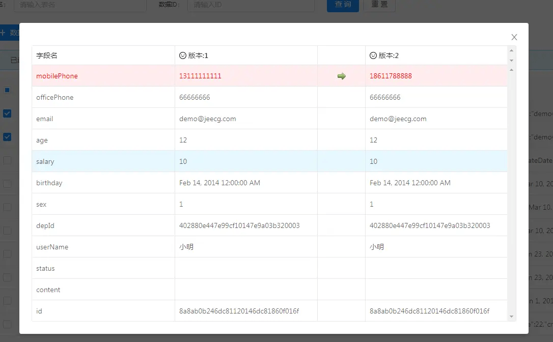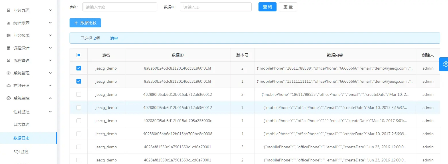 3.此功能会将表单每次变更的数据内容以版本方式存储,提供对比功能,查看每个字段变更情况