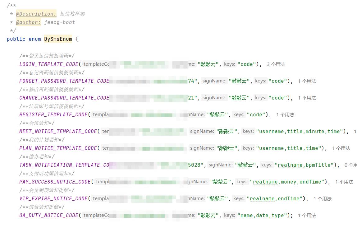 DySmsEnum.java中维护短信模板枚举,keys可为空
