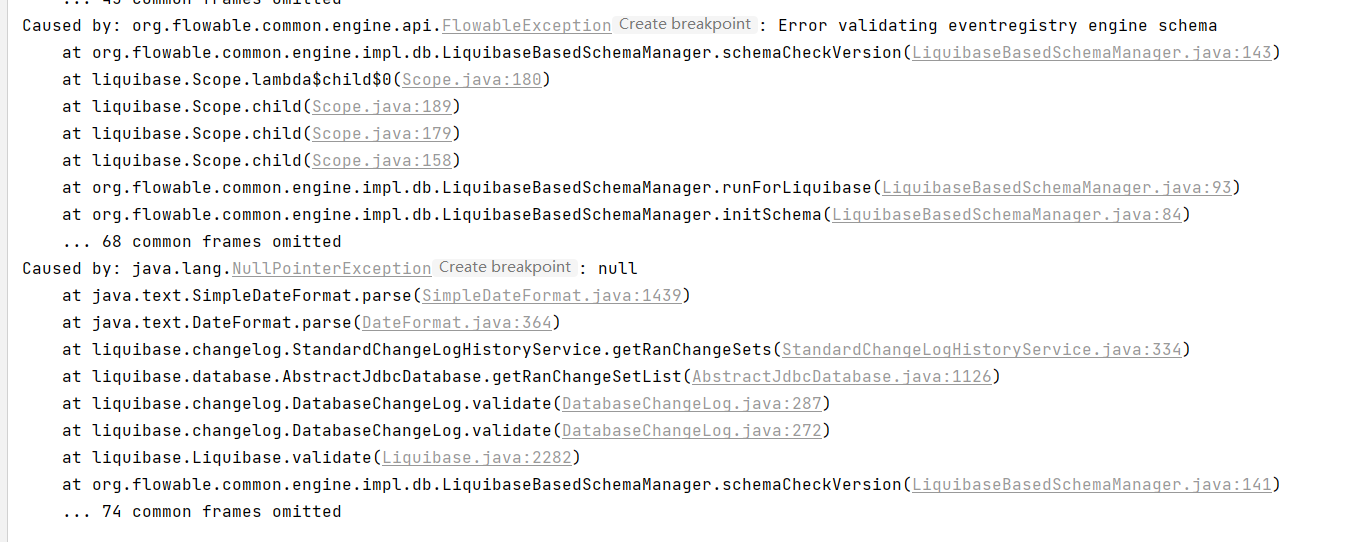 可能原因flowable版本和数据库中的版本不一致,这里是需要删除act和flw开头的表,让flowable自动生成表结构