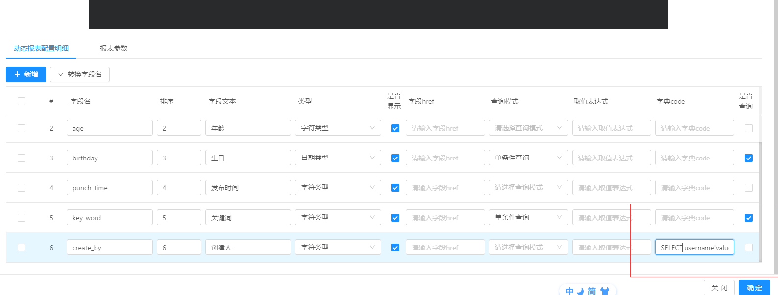 注意:这里的字典sql配置的是纯sql语句,不同数据库可能语法不同,请先确保配置的sql能正常查询出数据