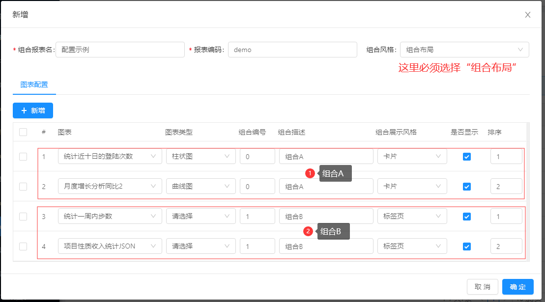 - 组合编号:多数据源可以有多个组合,相同组合编号的组合描述、组合展示风格会相互联动