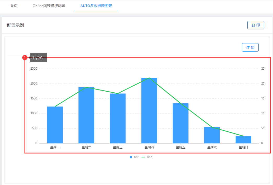 组合报表就是将两个报表合成一个报表,分别展示为柱状图和曲线图