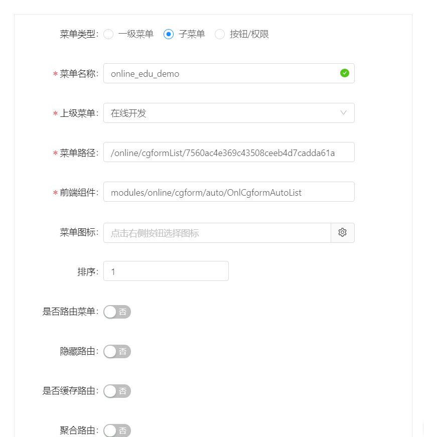 菜单路径规则:online/cgformList/{code},这里的7560ac4e369c43508ceeb4d7cadda61a就是{code}实际的值,即online表单配置表的ID