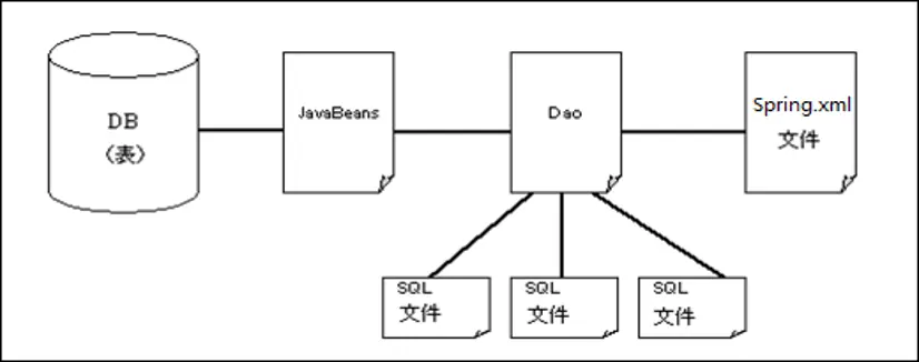 使用MiniDao功能时,作成的JavaBeans,Dao(.java),spring.xml文件,SQL文件(.sql)之间关系如下图: